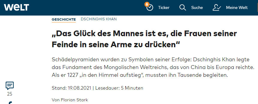 Zeitgleich zu den grausigen Ereignisse in Afghanistan erzählt ein WELT-Artikel von Dschinghis Khan. Zitate verdeutlichen die Kriegsführung dieses Massenmörders. Entschlüsselen solche Sätze den Fundamentalismus fanatischer Religioten? Was können Westliche Werte wie Freiheit, Gleichheit, Schwesterlichkeit fanatischen ReligiotInen entgegen setzen?