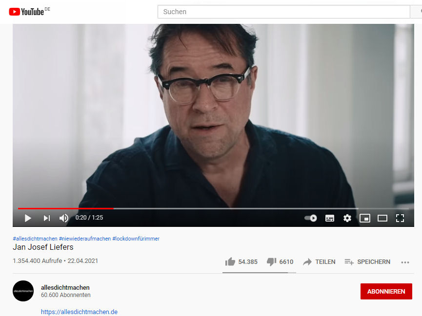 Der vom Tatort her als Professor Börne bekannte Schauspieler Jan Josef Liefers bringt in 85 Sekunden Politiker wie Journalisten in Rage. Als 73jähriger Blogger mit Vorerkrankungen gilt mein Kampf dem Überleben. Wo bleibt meine Energie, an Regierenden wie Liefers zu zweifeln? Mich bezaubert seit zehn Jahren mein erster Frühling in Deutschland, weil Auslandsreisen die Seuchengefahr verhindern. So bereichern Radausflüge nach Mitwitz, Kulmbach und Bamberg meine kleine Welt.