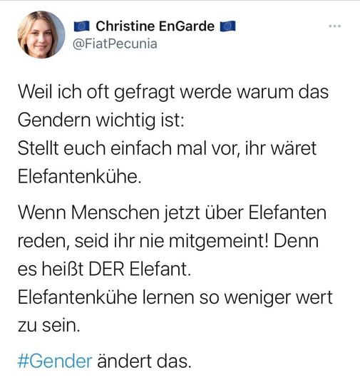 Es gibt schon so dumme Weiber. Es heißt nicht nur "der Elefant", sondern es heißt auch "der Mensch". Das sind alle Menschen, natürlich auch Frauen. Mit "der Elefant" sind alle Elefanten gemeint, natürlich auch Elefantinnen! Aber wer Stroh im Kopf hat und keinerlei Sprachgefühl, der merkt das nicht - ahäm ... wer Stroh im Kopf hat, die merkt das nicht. (Welch excellentes Deutsch!) Die weiblichen Elefantinnen sind übrigens Elefantenkühe. Vielleicht ist diese Frau EnGarde auch eine Kuh.